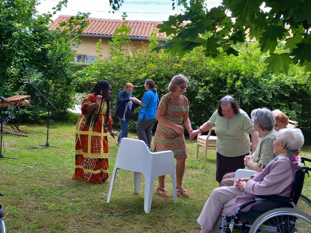 Les musiciens, d’une énergie communicative, ont su créer une ambiance chaleureuse, mêlant percussions, chants et danses traditionnelles. Certains résidents ont même été invités à participer, en tapant dans les mains ou en bougeant au rythme des tambours. Il n’a pas fallu longtemps pour que les sourires s’installent, et que les regards s’illuminent.