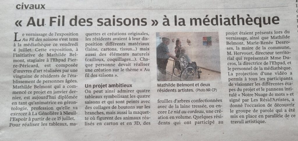 Son stage a donné naissance à un magnifique projet collectif : l’exposition « Au fil des saisons », réalisée avec les résidents et présentée à la médiathèque de Civaux du 4 juillet au 23 août 2025.