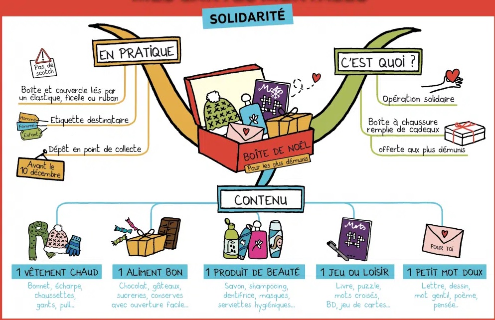 Dans chaque boîte : quelque chose de chaud (écharpes, gants, chaussettes…), quelque chose de bon (biscuits, chocolats, douceurs de Noël…), un petit jeu pour égayer les journées, un produit d’hygiène essentiel… et surtout, un mot tendre ou une carte faite main pour réchauffer les cœurs.