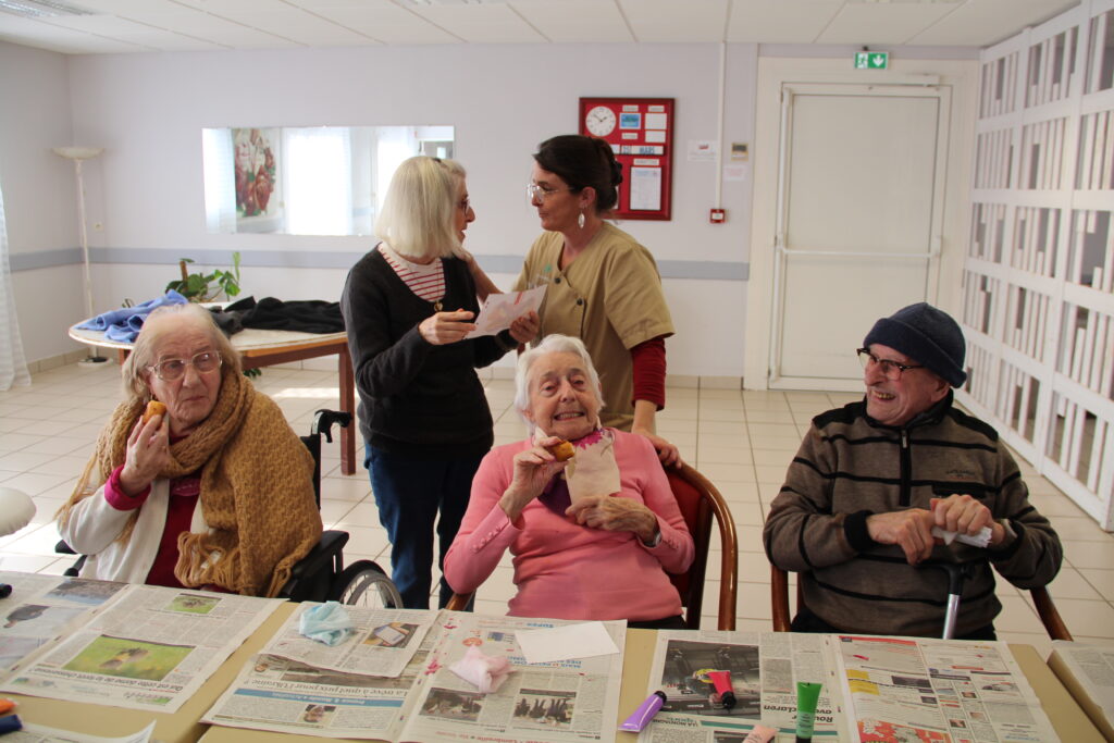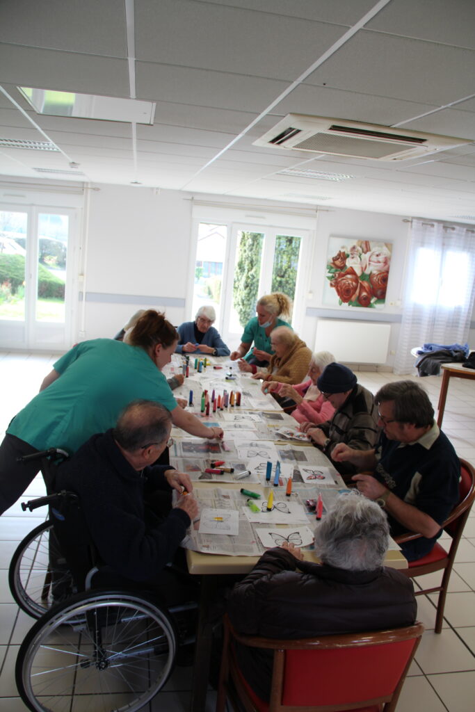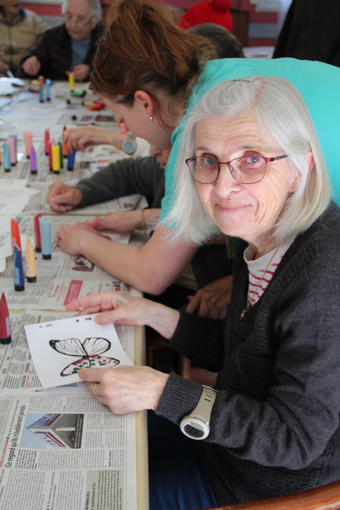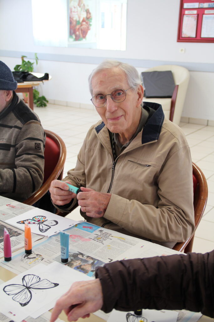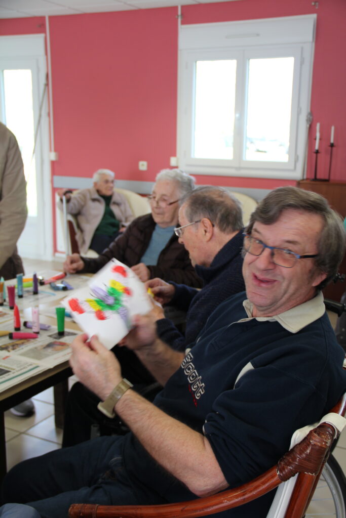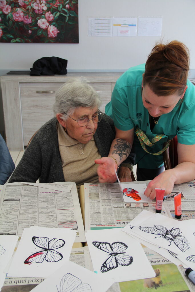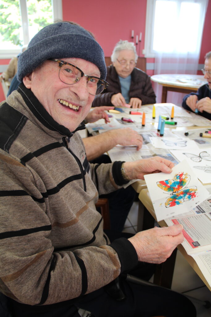 Le résultat a surpris tout le monde. De magnifiques lépidoptères colorés sont nés sous les pinceaux de chacun. Ce moment créatif a beaucoup plu. Résidents comme soignants ont apprécié la liberté d’expression et la variété des teintes.