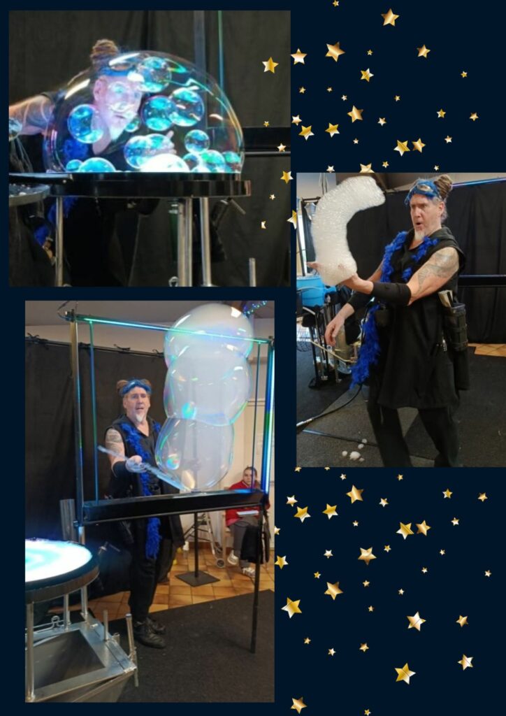 Mais cette fête ne s’est pas limitée aux enfants du personnel. Nos résidents étaient pleinement associés à l’événement, réunis pour assister à un spectacle animé par Ludovic, dompteur de bulles. Féerie, émerveillement et sourires ont été au rendez-vous pour les grands comme pour les petits.