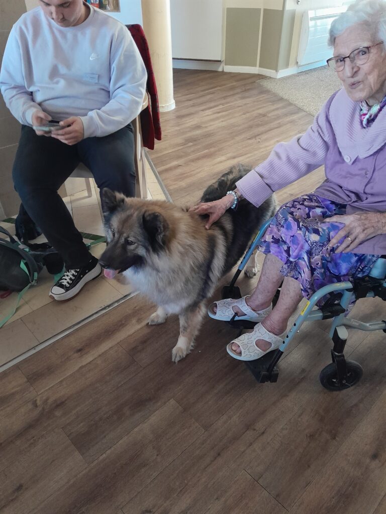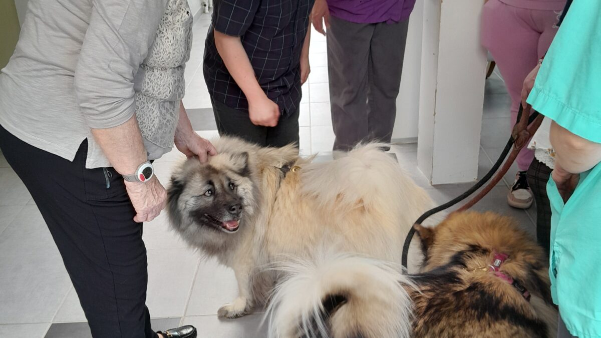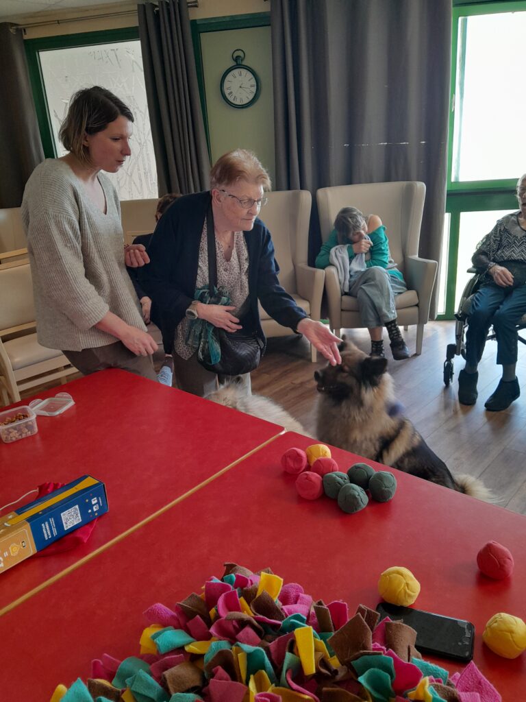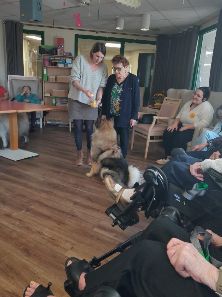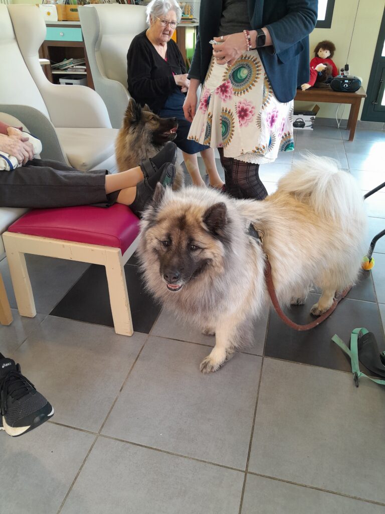 Il régnait une atmosphère toute particulière au Clos des Tours ce jour-là… Et pour cause : Prana et Lilou, deux superbes chiens de race Eurasier, sont venus rendre visite à nos résidents dans le cadre d’une séance de médiation animale.